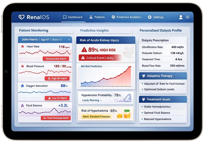 RenalOS is an Artificial Intelligence–powered digital nephrology platform designed to continuously analyse patient, machine, and treatment data to predict adverse events, trigger timely actions, and personalise dialysis care.